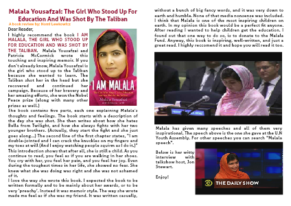 I highly recommend the book I AM MALALA, THE GIRL WHO STOOD UP FOR EDUCATION AND WAS SHOT BY THE TALIBAN. Malala Yousafzai and Patricia McCormick wrote this touching and inspiring memoir. If you don’t already know, Malala Yousafzai is the girl who stood up to the Taliban because she wanted to learn. The Taliban shot her in the head but she recovered and continued her campaign. Because of her bravery and her amazing efforts, she won the Nobel Peace prize (along with many other prizes as well.)