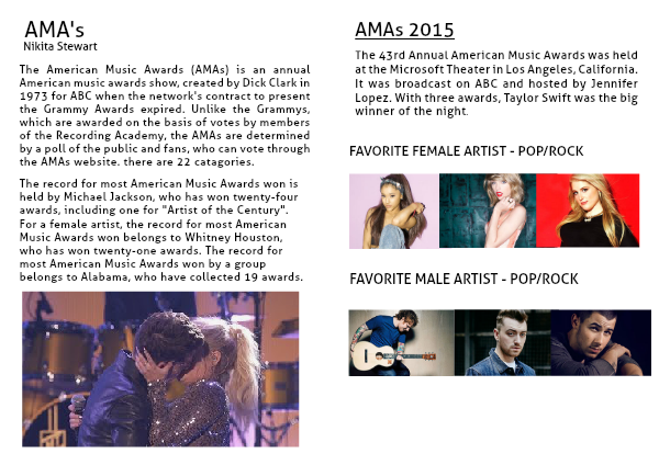The 43rd Annual American Music Awards was held at the Microsoft Theater in Los Angeles, California. It was broadcast on ABC and hosted by Jennifer Lopez. With three awards, Taylor Swift was the big winner of the night.