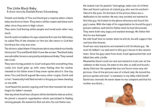 Meanwhile David could not rest and started to look over all the cabinets in the house. He went to the attic as well and found a dusty little box. He opened the box and fount some very old pictures. One of the pictures was of a black lady. He turned the picture upside and read: "a memento to my little child David". David was stunned. He never knew he was adopted and that his mother was black….