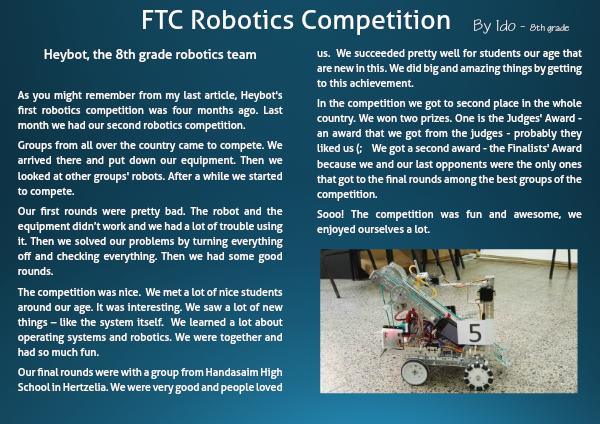 Our final rounds were with a group from Handasaim High School in Hertzelia. We were very good and people loved us. We succeeded pretty well for students our age that are new in this. We did big and amazing things by getting to this achievement.