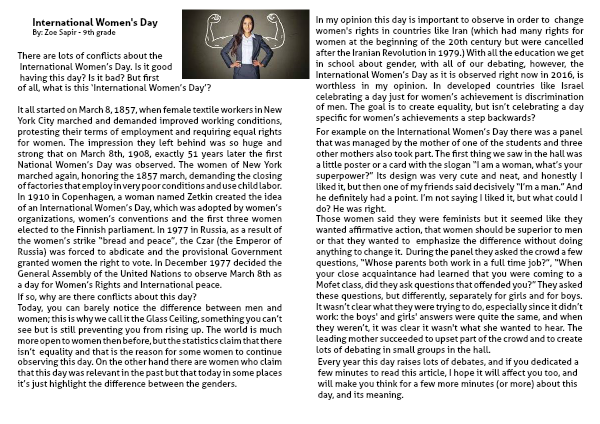 In my opinion this day is important to observe in order to change women's rights in countries like Iran (which had many rights for women at the beginning of the 20th century but were cancelled after the Iranian Revolution in 1979.) With all the education we get in school about gender, with all of our debating, however, the International Women’s Day as it is observed right now in 2016, is worthless in my opinion. In developed countries like Israel celebrating a day just for women’s achievement is discrimination of men. The goal is to create equality, but isn’t celebrating a day specific for women’s achievements a step backwards?