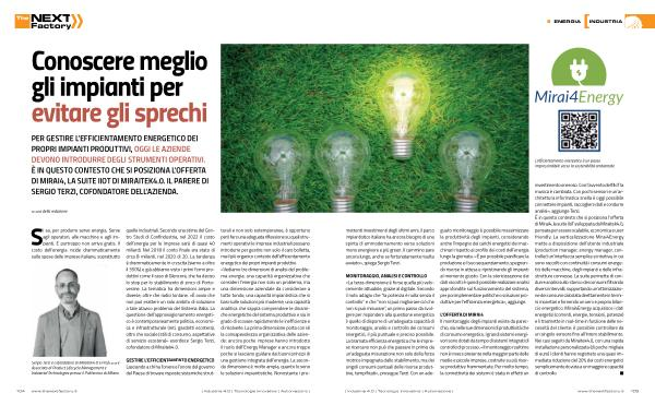 PER GESTIRE L ’ EFFICIENTAMENTO ENERGETICO DEI PROPRI IMPIANTI PRODUTTIVI , OGGI LE AZIENDE DEVONO INTRODURRE DEGLI STRUMENTI OPERATIVI . È IN QUESTO CONTESTO CHE SI POSIZIONA L ’ OFFERTA DI MIRAI4 , LA SUITE IIOT DI MIRAITEK4.0 . IL PARERE DI SERGIO TERZI , COFONDATORE DELL ’ AZIENDA .