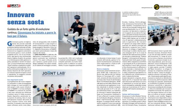 Ricerca congiunta Giovenzana crede fortemente nel progetto JOiiNT LAB , il laboratorio congiunto nato dall ’ accordo tra l ’ Istituto Italiano di Tecnologia ( IIT ) e Intellimech , consorzio di ricerca meccatronica promosso oltre 10 anni fa da Kilometro Rosso e Confindustria Bergamo . JOiiNT LAB opera sui temi della robotica e della meccatronica per applicazioni in ambito industriale : le attività si svolgono nella sede genovese di IIT e nel campus di Kilometro Rosso , con l ’ obiettivo di rinforzare il sistema industriale del Paese con l ’ innovazione . Intellimech e IIT sono affiancati in questa iniziativa da Confindustria Bergamo , Kilometro Rosso e dall ’ Università degli Studi di Bergamo . A sostegno diretto del laboratorio congiunto ci sono nove aziende aderenti al Consorzio Intellimech : ABB ,
