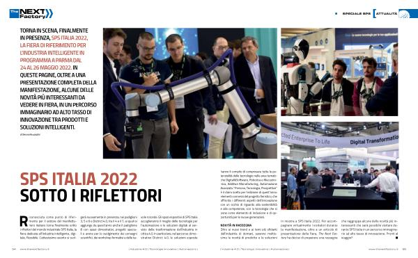 TORNA IN SCENA , FINALMENTE IN PRESENZA , SPS ITALIA 2022 , LA FIERA DI RIFERIMENTO PER L ’ INDUSTRIA INTELLIGENTE IN PROGRAMMA A PARMA DAL 24 AL 26 MAGGIO 2022 . IN QUESTE PAGINE , OLTRE A UNA PRESENTAZIONE COMPLETA DELLA MANIFESTAZIONE , ALCUNE DELLE NOVITÀ PIÙ INTERESSANTI DA VEDERE IN FIERA , IN UN PERCORSO IMMAGINARIO AD ALTO TASSO DI INNOVAZIONE TRA PRODOTTI E SOLUZIONI INTELLIGENTI .