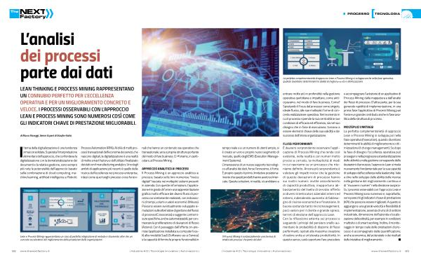 MOLTEPLICI VANTAGGI La perfetta complementarietà di approccio Lean e Process Mining si sviluppa poi nella fase operativa ( l ’ execution ), quando diventano determinanti le abilità di miglioramento e ottimizzazione ( il change management ). Se dopo la fase di disegno l ’ eccellenza operativa può proseguire nella progressiva standardizzazione delle attività e nella gestione consapevole delle deviazioni di processo , l ’ approccio Lean si rivela nuovamente fondamentale per la sua capacità di sviluppo dell ’ eccellenza nella leadership . Vale a dire nello sviluppo delle abilità delle risorse nella gestione del miglioramento continuo e di “ muovere i numeri ” nella direzione auspicata . I processi osservabili con l ’ approccio Lean e Process Mining sono numerosi e , soprattutto , sono parecchi gli indicatori chiave di prestazione ( KPI ) che possono essere migliorati . A questo si aggiungono una grande velocità e flessibilità di implementazione , assenza di vincoli di settore industriale , dimensione dell ’ azienda e localizzazione delle attività , per esempio in condizioni multisito o di smart working . Inoltre , il monitoraggio in tempo reale delle prestazioni di processo è accompagnato dalla quantificazione , anche economica , del potenziale o dei risultati delle iniziative di miglioramento .