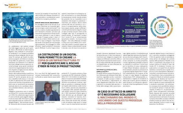 Il gemello digitale simula il macchinario e non il processo produttivo proteggendo il PLC che gestisce tutte le automazioni , senza entrare nel dettaglio dei comandi specifici della produzione . Rispetto a una rete IT , il macchinario che produce ha un numero inferiore di indirizzi IP tipici del mondo OT . Il simulatore riconosce con quale porta e con quale firma di sistema operativo si presenta ed è in grado di capire se vi sono vulnerabilità o debolezze . I costruttori , una volta immesso sul mercato il macchinario , hanno la possibilità con il supporto di ReeVo di mantenere questa caratteristica di riduzione del rischio cyber anche nel futuro in catena di produzione a seguito di nuove vulnerabilità che si dovessero presentare . « Va sottolineato comunque che le possibilità di attacco nel mondo OT variano in modo più lento rispetto al settore IT », ha precisato Briganti . Grazie all ’ esperienza ventennale , ReeVo risponde alla crescente necessità di protezione degli ambiti produttivi facendosi promotore e portavoce di una vera e propria cultura della sicurezza e offrendo soluzioni mirate per tutte le fasi del processo industriale , sia da un punto di vista preventivo che difensivo .