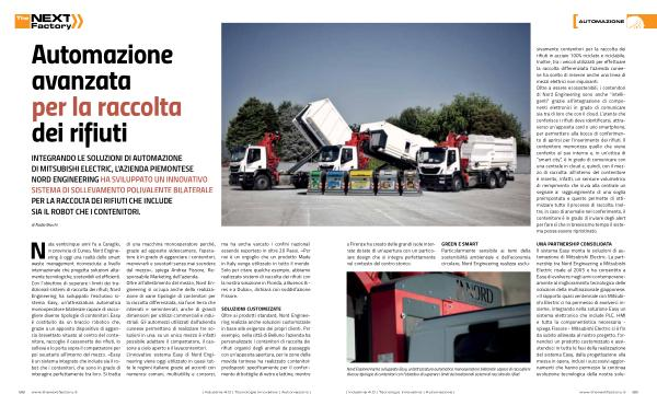 INTEGRANDO LE SOLUZIONI DI AUTOMAZIONE DI MITSUBISHI ELECTRIC , L ’ AZIENDA PIEMONTESE NORD ENGINEERING HA SVILUPPATO UN INNOVATIVO SISTEMA DI SOLLEVAMENTO POLIVALENTE BILATERALE PER LA RACCOLTA DEI RIFIUTI CHE INCLUDE SIA IL ROBOT CHE I CONTENITORI .