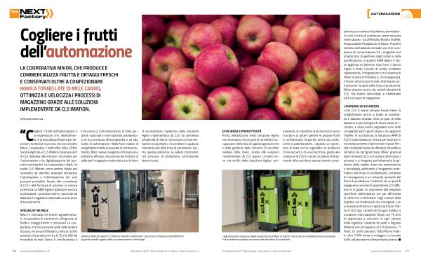” i frutti dell ’ automazione è un ’ espressione che , letteralmente , si presta alla perfezione per descrivere la storia di successo che ha coinvolto Mivor , Cooperativa Frutticoltori Mivo-Ortler Società Agricola , e CLS iMation , business unit di CLS dedicata alle soluzioni innovative per l ’ automazione e la digitalizzazione dei processi manutentivi . La cooperativa , infatti , ha scelto CLS iMation come partner ideale per sostenere gli obiettivi aziendali attraverso l ’ automazione e l ’ ottimizzazione dei suoi processi produttivi . Grazie alla consulenza di CLS e alla fornitura di soluzioni su misura incentrata su AMR Agilox l ’ azienda è riuscita a velocizzare i processi interni , riuscendo ad abbinare il magazzino automatico con le linee di svuotamento . il processo di confezionamento di mele per i clienti nazionali e internazionali , avvalendosi di una struttura all ’ avanguardia e ad alto livello di automazione . Nella fase iniziale di progettazione della nuova sala di confezionamento , Mivor aveva l ’ esigenza di trovare una soluzione efficace che potesse permettere di abbinare il magazzino automatico con le linee
