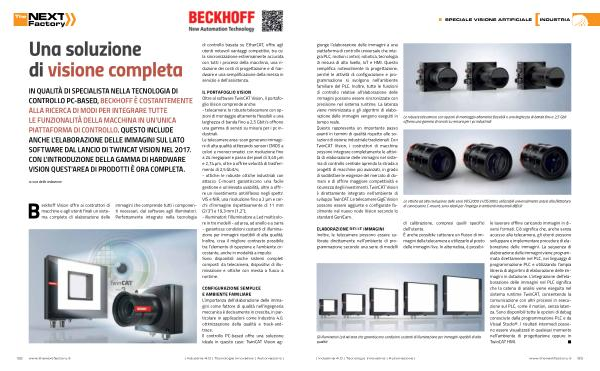 SPECIALE VISIONE ARTIFICIALE INDUSTRIA giunge l ’ elaborazione delle immagini a una piattaforma di controllo universale che integra PLC , motion control , robotica , tecnologia di misura di alto livello , IoT e HMI . Questo semplifica notevolmente la progettazione , perché le attività di configurazione e programmazione si svolgono nell ’ ambiente familiare del PLC . Inoltre , tutte le funzioni di controllo relative all ’ elaborazione delle immagini possono essere sincronizzate con precisione nel sistema runtime . La latenza viene minimizzata e gli algoritmi di elaborazione delle immagini vengono eseguiti in tempo reale . Questo rappresenta un importante passo avanti in termini di qualità rispetto alle soluzioni di visione industriale tradizionali . Con TwinCAT Vision , i costruttori di macchine possono integrare completamente le attività di elaborazione delle immagini nel sistema di controllo centrale aprendo la strada a progetti di macchine più avanzati , in grado di soddisfare le esigenze del mercato di domani e di offrire maggiore competitività e sicurezza degli investimenti . TwinCAT Vision è direttamente integrato nell ’ ambiente di sviluppo TwinCAT . Le telecamere GigE Vision possono essere aggiunte e configurate facilmente nel nuovo nodo Vision secondo lo standard GenICam .