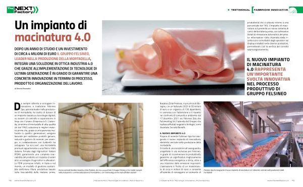 IL NUOVO IMPIANTO 4.0 Proprio di recente Felsineo Spa ha inaugurato il nuovo impianto di macinatura , elemento centrale nella produzione della mortadella . Si tratta di una soluzione all ’ avanguardia , progettata in via esclusiva per Felsineo , in grado di incrementare la produttività , garantire un significativo miglioramento dell ’ efficienza energetica e idrica , oltre a una riduzione delle emissioni inquinanti . L ’ operazione è frutto di un investimento di circa 4 milioni di euro e consente all ’ azienda di conseguire un aumento di