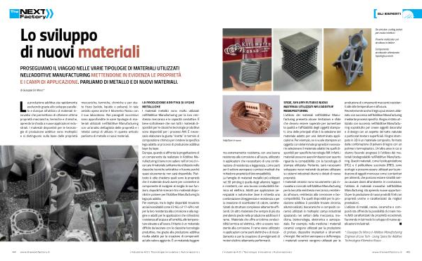 La produzione additiva sta rapidamente evolvendo grazie allo sviluppo parallelo e dunque all ’ utilizzo di materiali innovativi che permettono di ottenere ottime proprietà meccaniche , termiche e chimiche , aprendo la strada a nuove applicazioni industriali . I materiali disponibili per le tecnologie di produzione additive sono molteplici e si distinguono sulla base delle proprietà meccaniche , termiche , chimiche e per stato fisico ( solido , liquido o polvere ). In tale ambito opera anche il Kilometro Rosso con il suo laboratorio . Nei paragrafi successivi sono approfondite le varie tipologie di materiali utilizzati nell ’ Additive Manufacturing con un ’ analisi dettagliata delle proprietà e i relativi campi di utilizzo . In questo articolo parliamo di metallo e nuovi materiali .