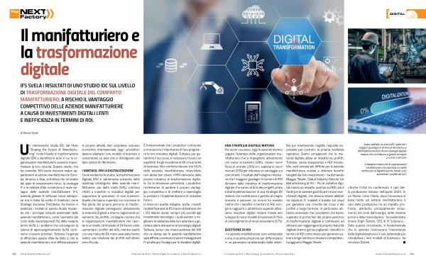 QUESTIONE DI ROI « Le aziende manifatturiere sono sottoposte a una crescente pressione per differenziarsi in un panorama caratterizzato dalla volatilità pur mantenendo l ’ agilità , requisito essenziale per costruire la propria resilienza operativa . Siamo consapevoli che la maturità digitale abbia un impatto sui profitti . Tuttavia , senza trasparenza e ROI misurabile , sarà sempre più difficile per le aziende manifatturiere scalare e ottenere benefici tangibili dai loro investimenti - ha dichiarato Maggie Slowik , Global Industry Director for Manufacturing di IFS - Più le iniziative digitali hanno un impatto positivo sul ROI , più è facile per le aziende giustificare i nuovi investimenti digitali , che devono essere abilitati da soluzioni IT scalabili e basate sul cloud per garantire una crescita dei ricavi e dei profitti a lungo termine . In particolare , abbiamo osservato che i produttori che hanno superato le prime fasi del proprio percorso di trasformazione digitale e continuano ad attivarsi per raggiungere la propria maturità digitale stanno già raccogliendo i benefici in termini di ROI come mezzo per generare valore a lungo termine e rimanere competitivi », ha aggiunto Maggie Slowik .