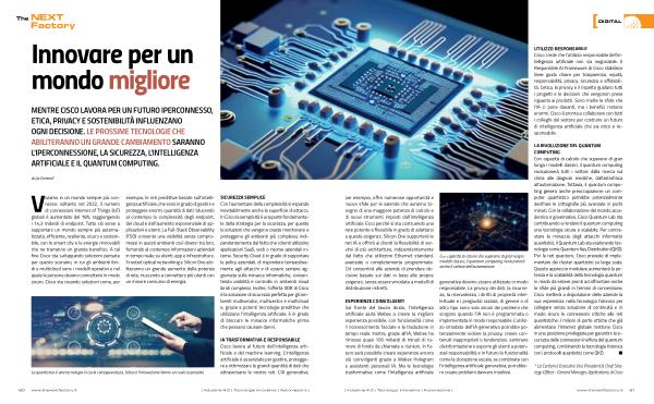 MENTRE CISCO LAVORA PER UN FUTURO IPERCONNESSO , ETICA , PRIVACY E SOSTENIBILITÀ INFLUENZANO OGNI DECISIONE . LE PROSSIME TECNOLOGIE CHE ABILITERANNO UN GRANDE CAMBIAMENTO SARANNO L ’ IPERCONNESSIONE , LA SICUREZZA , L ’ INTELLIGENZA ARTIFICIALE E IL QUANTUM COMPUTING .