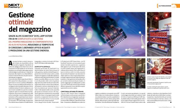 COMPETENZA E AFFIDABILITÀ CONDIVISE « Da anni LAPP Sistemi Italia è impegnata nell ’ ottimizzazione della propria operatività e RS è stata lieta di accompagnarla in questo percorso con una soluzione come RS ScanStock ® - commenta Marco Beltramo , Sales Director di RS Italia - Competenza e affidabilità sono i valori che