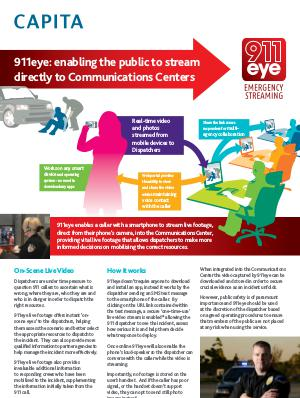 911eye enables a caller with a smartphone to stream live footage, direct from their phone’ s camera, into the Communications Center, providing vital live footage that allows dispatchers to make more informed decisions on mobilising the correct resources.