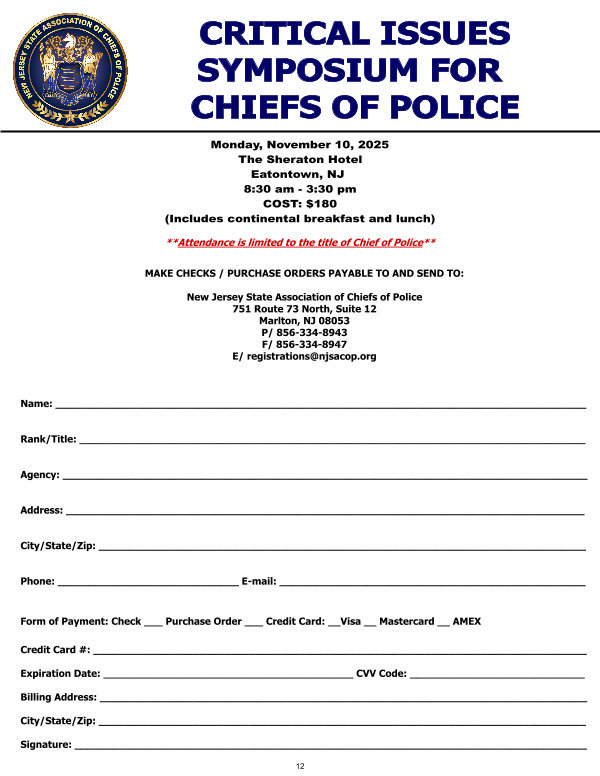 New Jersey State Association of Chiefs of Police 751 Route 73 North, Suite 12 Marlton, NJ 08053 P / 856-334-8943 F / 856-334-8947 E / registrations @ njsacop. org