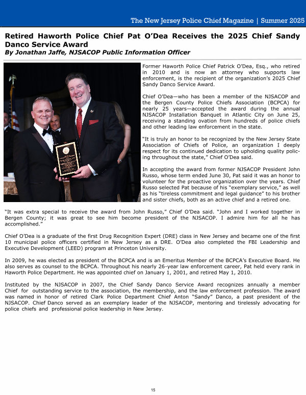 Former Haworth Police Chief Patrick O’ Dea, Esq., who retired in 2010 and is now an attorney who supports law enforcement, is the recipient of the organization’ s 2025 Chief Sandy Danco Service Award.
