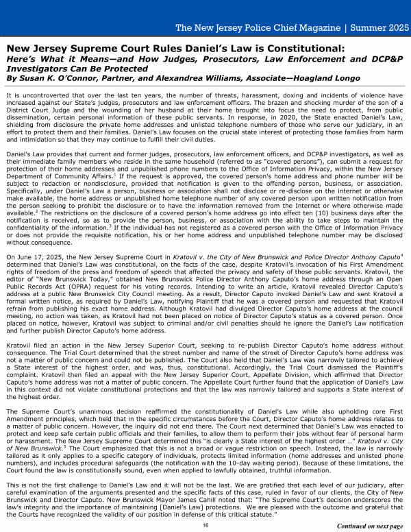 On June 17, 2025, the New Jersey Supreme Court in Kratovil v. the City of New Brunswick and Police Director Anthony Caputo 4 determined that Daniel’ s Law was constitutional, on the facts of the case, despite Kratovil’ s invocation of his First Amendment rights of freedom of the press and freedom of speech that affected the privacy and safety of those public servants. Kratovil, the editor of ― New Brunswick Today,‖ obtained New Brunswick Police Director Anthony Caputo’ s home address through an Open Public Records Act( OPRA) request for his voting records. Intending to write an article, Kratovil revealed Director Caputo’ s address at a public New Brunswick City Council meeting. As a result, Director Caputo invoked Daniel’ s Law and sent Kratovil a formal written notice, as required by Daniel’ s Law, notifying Plaintiff that he was a covered person and requested that Kratovil refrain from publishing his exact home address. Although Kratovil had divulged Director Caputo’ s home address at the council meeting, no action was taken, as Kratovil had not been placed on notice of Director Caputo’ s status as a covered person. Once placed on notice, however, Kratovil was subject to criminal and / or civil penalties should he ignore the Daniel’ s Law notification and further publish Director Caputo’ s home address.
