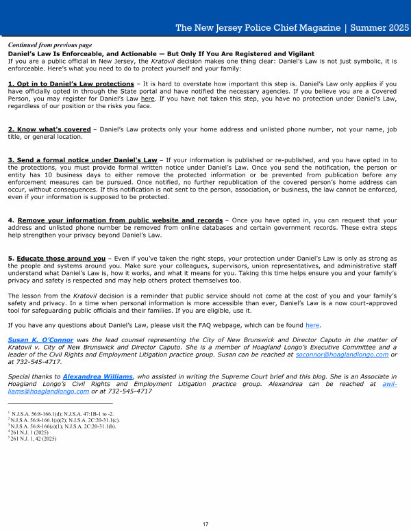 Daniel’ s Law Is Enforceable, and Actionable— But Only If You Are Registered and Vigilant If you are a public official in New Jersey, the Kratovil decision makes one thing clear: Daniel’ s Law is not just symbolic, it is enforceable. Here’ s what you need to do to protect yourself and your family: