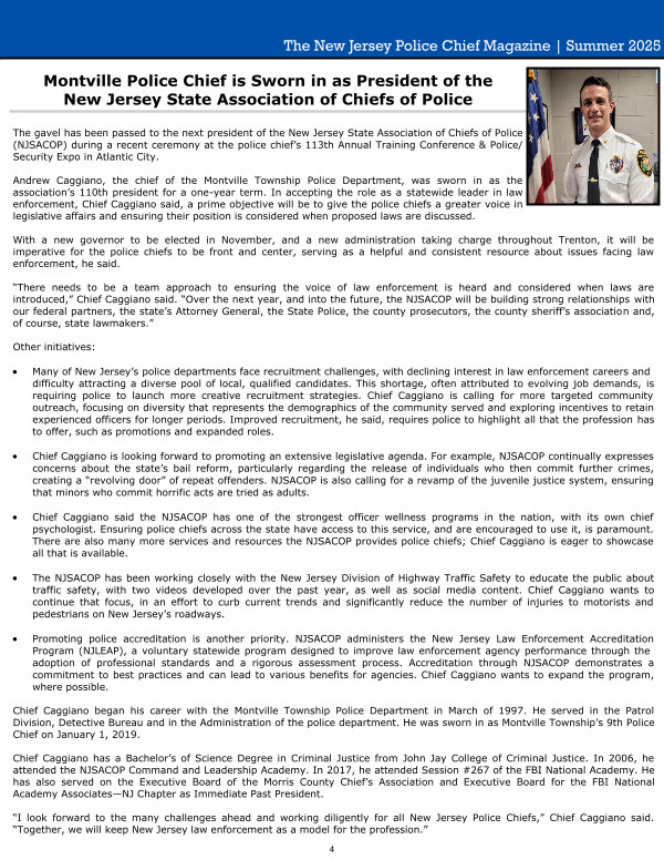 ― I look forward to the many challenges ahead and working diligently for all New Jersey Police Chiefs,‖ Chief Caggiano said. ― Together, we will keep New Jersey law enforcement as a model for the profession.‖