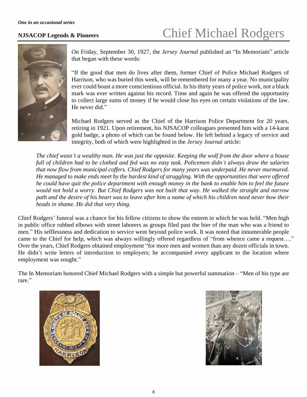 “ If the good that men do lives after them, former Chief of Police Michael Rodgers of Harrison, who was buried this week, will be remembered for many a year. No municipality ever could boast a more conscientious official. In his thirty years of police work, not a black mark was ever written against his record. Time and again he was offered the opportunity to collect large sums of money if he would close his eyes on certain violations of the law. He never did.”