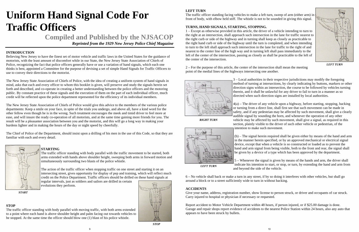 INTRODUCTION Believing New Jersey to have the finest set of motor vehicle and traffic laws in the United States for the guidance of motorists, with the least amount of discomfort while in our State, the New Jersey State Association of Chiefs of Police, recognizing the fact that police officers generally have or use a variation of hand signals, which each one thinks is best, appointed a Committee for the purpose of devising a set of simple Hand Signals for Traffic Officers to use to convey their directions to the motorist.