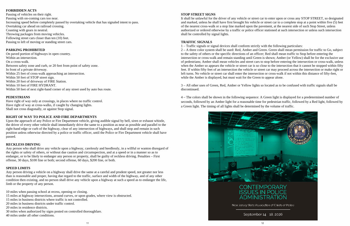 PARKING PROHIBITED On paved portion of highways in open country. Within an intersection. On a cross-walk. Between safety zone and curb, or 20 feet from point of safety zone. In front of a private driveway. Within 25 feet of cross-walk approaching an intersection. Within 50 feet of STOP street sign. Within 20 feet of driveway of FIRE Station. Within 10 feet of FIRE HYDRANT. Within 50 feet of next right-hand corner of any street used by auto bus route.