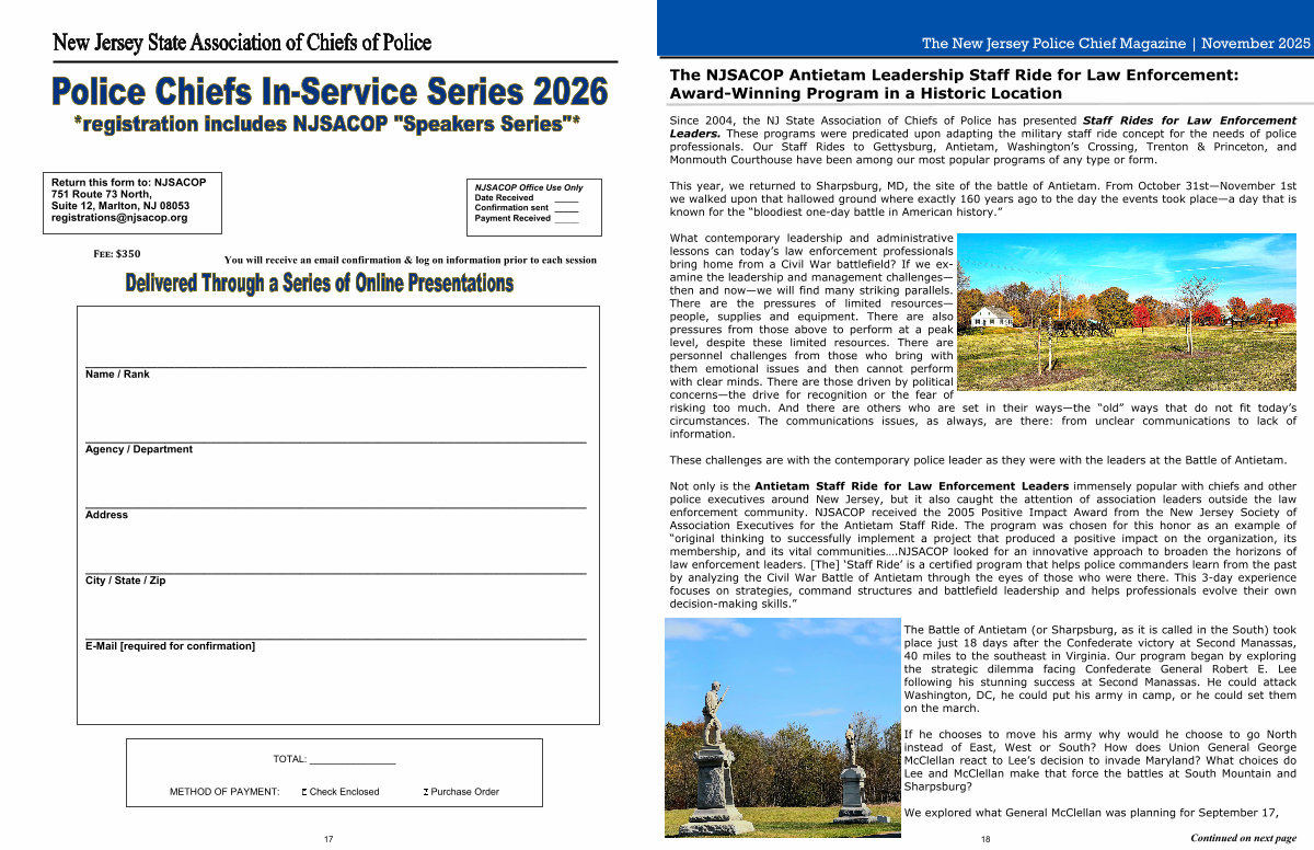 Since 2004, the NJ State Association of Chiefs of Police has presented Staff Rides for Law Enforcement Leaders. These programs were predicated upon adapting the military staff ride concept for the needs of police professionals. Our Staff Rides to Gettysburg, Antietam, Washington’ s Crossing, Trenton & Princeton, and Monmouth Courthouse have been among our most popular programs of any type or form.