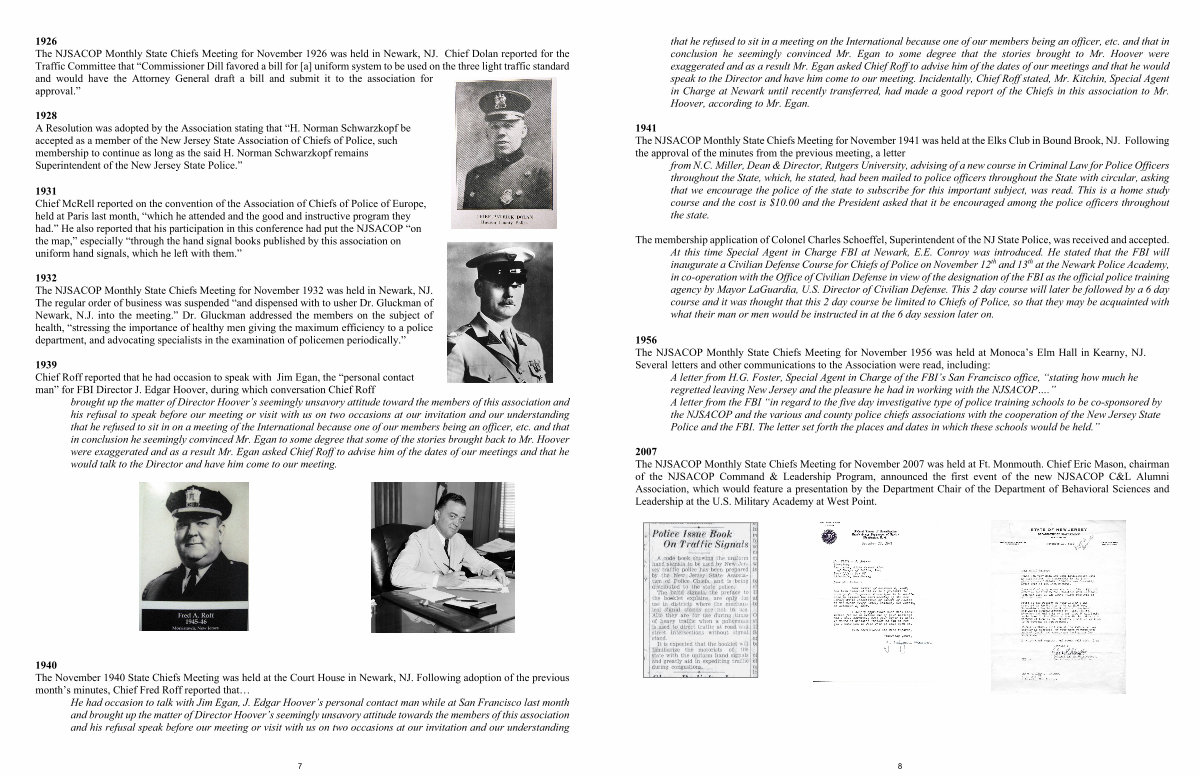 1940 The November 1940 State Chiefs Meeting was held at the Court House in Newark, NJ. Following adoption of the previous month’ s minutes, Chief Fred Roff reported that … He had occasion to talk with Jim Egan, J. Edgar Hoover’ s personal contact man while at San Francisco last month and brought up the matter of Director Hoover’ s seemingly unsavory attitude towards the members of this association and his refusal speak before our meeting or visit with us on two occasions at our invitation and our understanding