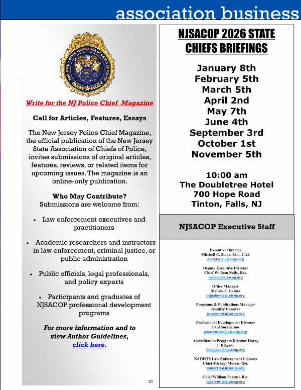 The New Jersey Police Chief Magazine, the official publication of the New Jersey State Association of Chiefs of Police, invites submissions of original articles, features, reviews, or related items for upcoming issues. The magazine is an online-only publication.