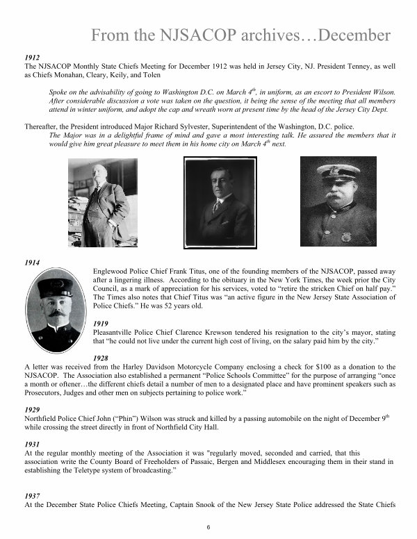1912 The NJSACOP Monthly State Chiefs Meeting for December 1912 was held in Jersey City, NJ. President Tenney, as well as Chiefs Monahan, Cleary, Keily, and Tolen
