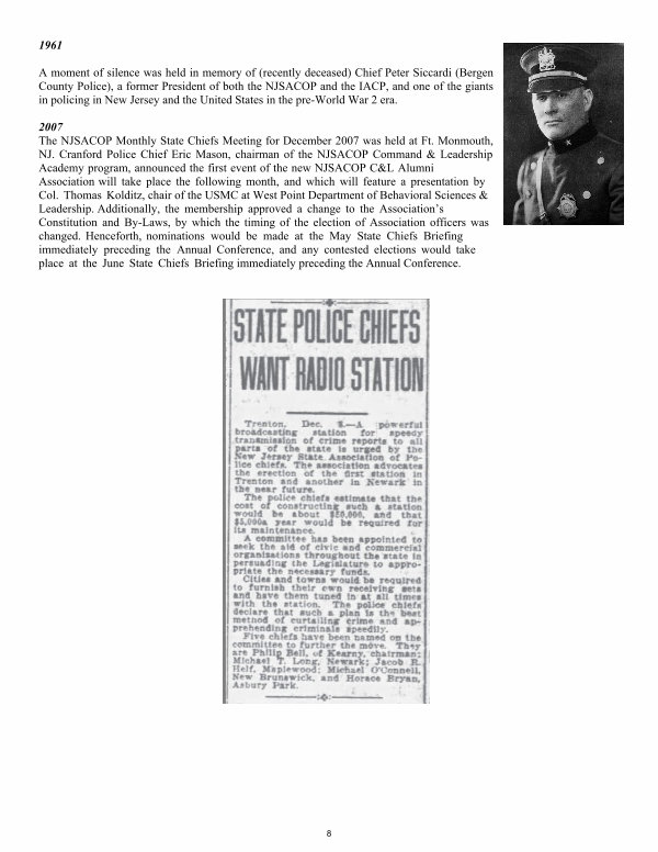 2007 The NJSACOP Monthly State Chiefs Meeting for December 2007 was held at Ft. Monmouth, NJ. Cranford Police Chief Eric Mason, chairman of the NJSACOP Command & Leadership Academy program, announced the first event of the new NJSACOP C & L Alumni Association will take place the following month, and which will feature a presentation by Col. Thomas Kolditz, chair of the USMC at West Point Department of Behavioral Sciences & Leadership. Additionally, the membership approved a change to the Association’ s Constitution and By-Laws, by which the timing of the election of Association officers was changed. Henceforth, nominations would be made at the May State Chiefs Briefing immediately preceding the Annual Conference, and any contested elections would take place at the June State Chiefs Briefing immediately preceding the Annual Conference.