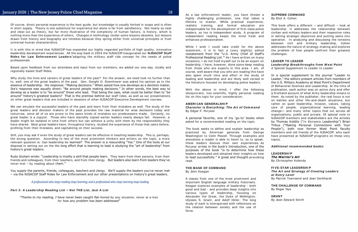Why study the lives and careers of great leaders of the past? For the answer, we need look no further than to, well, one of the great leaders of the past. Gen. Dwight D. Eisenhower was asked his opinion as to the essence of leadership. His response:“ Making decisions.” When asked how one develops as a decision maker, Ike’ s response was equally direct:“ Be around people making decisions.” In other words, the best way to develop as a leader is to“ be around” those who lead. That being the case, what could be better than to“ be around” history’ s greatest leaders? That is the premise behind our staff rides, as well as our presentations on other great leaders that are included in sessions of other NJSACOP Executive Development courses.