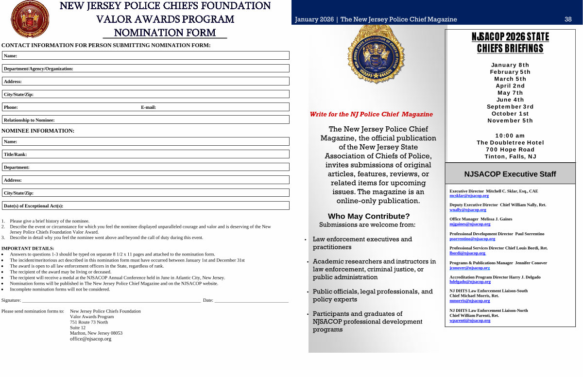 • Nomination forms will be published in The New Jersey Police Chief Magazine and on the NJSACOP website.
