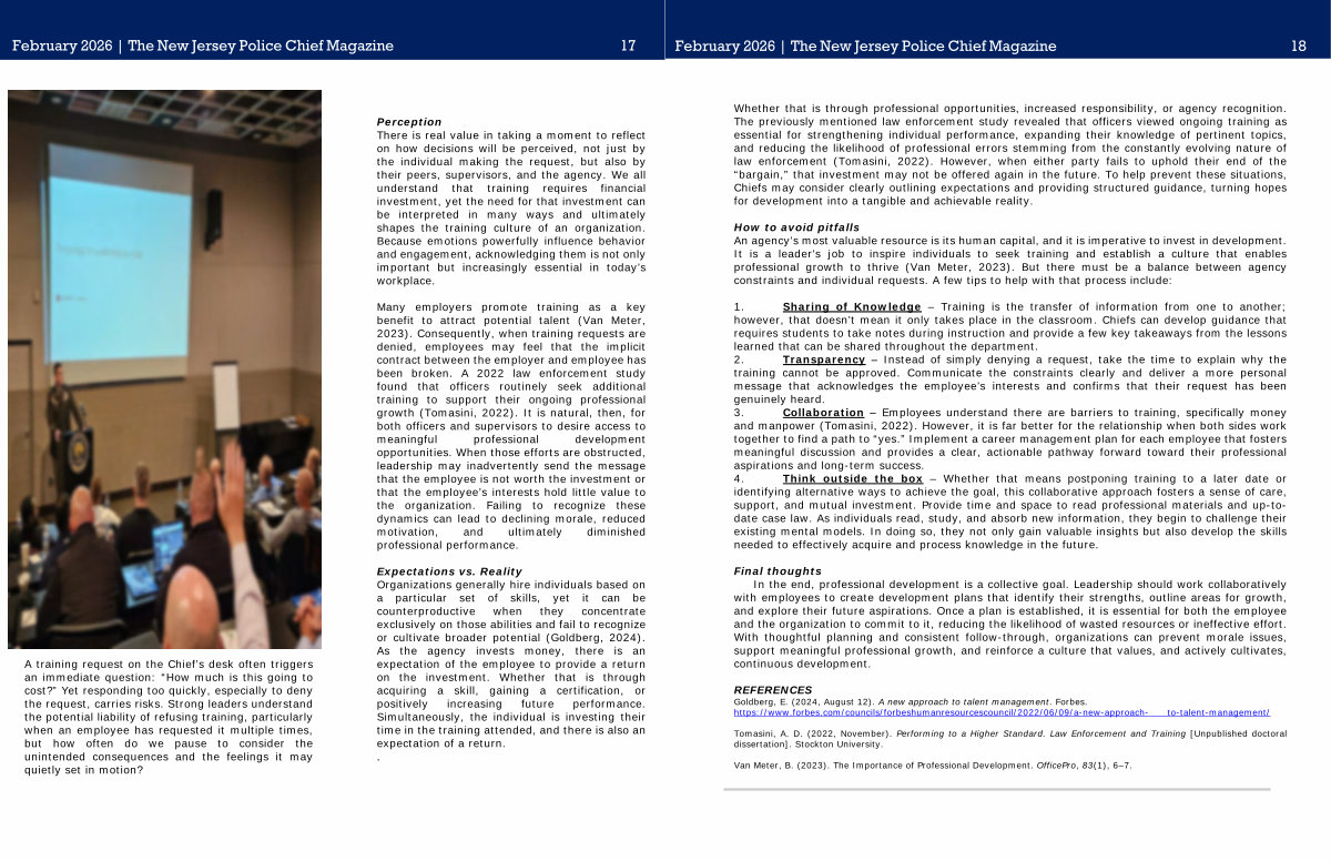 Whether that is through professional opportunities, increased responsibility, or agency recognition. The previously mentioned law enforcement study revealed that officers viewed ongoing training as essential for strengthening individual performance, expanding their knowledge of pertinent topics, and reducing the likelihood of professional errors stemming from the constantly evolving nature of law enforcement( Tomasini, 2022). However, when either party fails to uphold their end of the“ bargain,” that investment may not be offered again in the future. To help prevent these situations, Chiefs may consider clearly outlining expectations and providing structured guidance, turning hopes for development into a tangible and achievable reality.