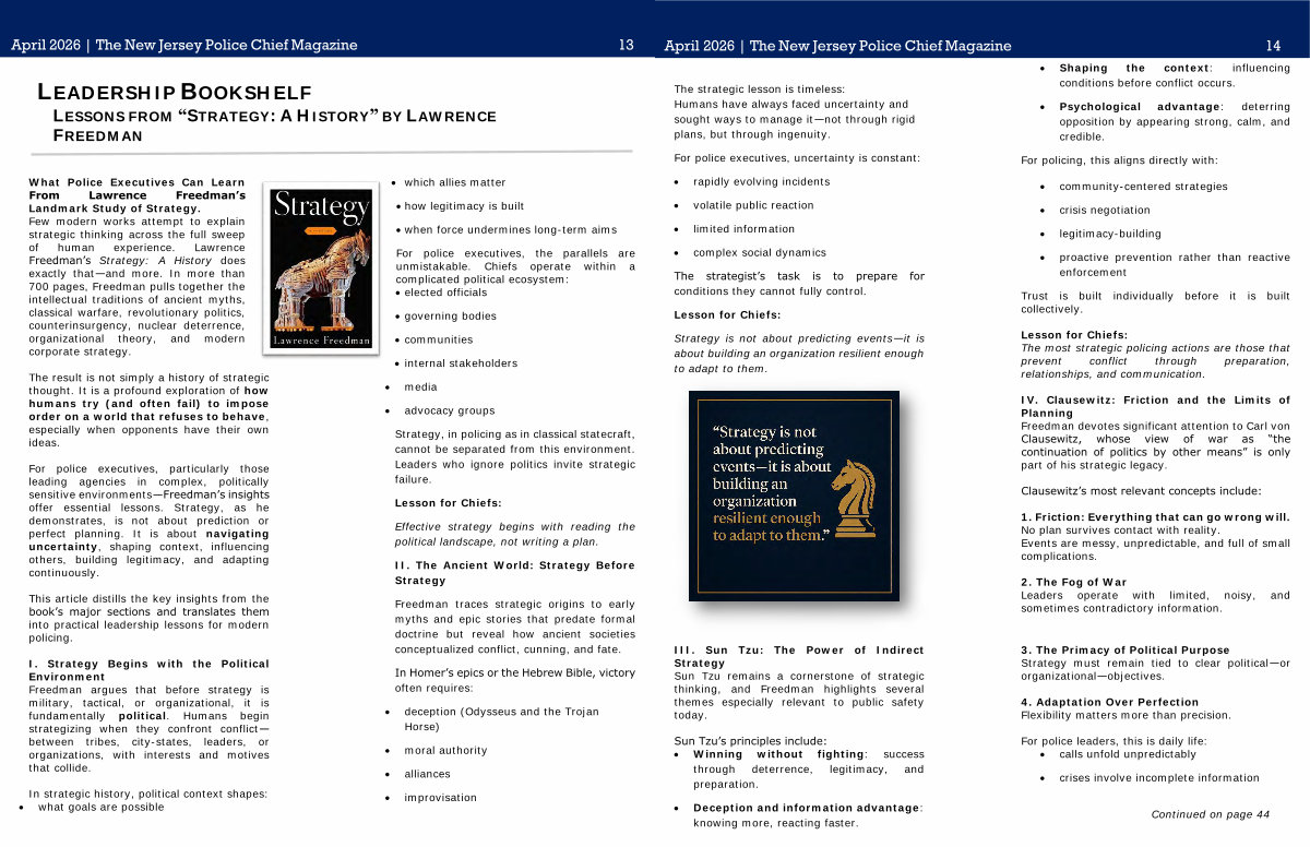 For police executives, particularly those leading agencies in complex, politically sensitive environments— Freedman’ s insights offer essential lessons. Strategy, as he demonstrates, is not about prediction or perfect planning. It is about navigating uncertainty, shaping context, influencing others, building legitimacy, and adapting continuously.