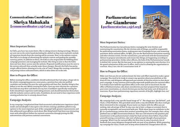 The Parliamentarian has two primary duties: managing the next election and maintaining the constitution. On the election side of things, you will be responsible for publicizing nomination forms, making your own Campaign Corner, and answering questions about national office. At NJCL, you run the Nominations Committee meeting and other election events. For the constitution, you will work with the Constitutional Advisor to propose amendments and ensure that things are happening according to parliamentary procedure. Unlike other officers, the bulk of the Parliamentarian’s work is behind-the-scenes. But the best part in my opinion is running the next election. It is the grand culmination of the year in office, and is vital in allowing the organization to continue. Also, I am a bit of a constitution nerd. :P