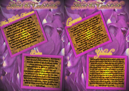 I will not write a long speech on myself as a person, but instead a short passage. I feel that in order to let someone know who you are you must show them through your actions and not through your words. I breathe and live Delta Sigma Theta. I love to help people on IMVU as well as real. I am outgoing, caring, and loving to anyone who needs it. I love to sing and make people laugh. I feel that laughter cleanses the soul and makes everything better. I am the type of person that will be there for someone when needed the most. I am a leader and I will succeed at anything I set out to do. I am also a strong believer in "If at first you don't succeed, try again". I know that I would represent Miss Purple and Gold well and I hope I have the opportunity to do as such.