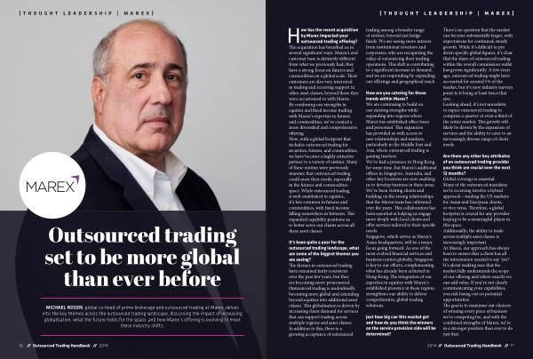 MICHAEL ROSEN , global co-head of prime brokerage and outsourced trading at Marex , delves into the key themes across the outsourced trading landscape , discussing the impact of increasing globalisation , what the future holds for the space , and how Marex ’ s offering is evolving to meet these industry shifts .