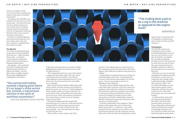 asserted , “ our trading group are viewed as part of the investment process with interaction and culture aligned . That ’ s difficult to replicate using outsourced trading .”
