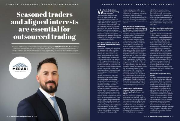 How did you decide the structure of your offering and how does it differ to competitors ? Outsourced trading already existed but the firms and their traders providing these services were functionally no different than that of an introducing broker or sell-side sales trader . There were a limited number of outsourced trading services offering a use case that we felt was genuinely accretive to the investment manager . I was determined to build a structure that allowed us to be the exact mirror image of a sophisticated buy-side trading desk , with just one structural difference : our traders would not be employees of the investment manager . Meraki Global Advisors ’ unbundled offering embraces the ethos of what outsourced trading is : operating as an unconflicted true extension of the investment manager – a quality that represents the model ’ s core value proposition . A true outsourced trade management solution , like the service we provide , strictly communicates orders to the client ’ s execution counterparties as an authorised trader of the fund . Our firm has stood by our promise to provide clients the highest level of service in the industry by meticulously managing the number of client mandates we take on , maintaining a 3:1 client to trader ratio , and only providing a full or supplemental trade management solution . These aspects allow our traders to be familiar with the inner workings of each client they support . We also do not offer backup trading services unless we are a supplemental solution and the client ’ s internal trader needs backup periodically . A trader that is not continuously involved in the implementation leg of the investment thesis and seldomly trades as a back-up trader , can be hazardous in our opinion .