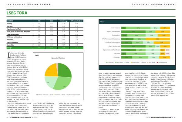 trend in ratings , moving to third place . It is , however , worth noting that clients are still happy with LSEG TORA , with this category still firmly sitting at Good this year . Taking a look at Chart 1 , over half of our respondents ’ rate LSEG TORA as Excellent ( 26 %) or Very Good ( 30 %). Last year , TORA was excited about its acquisition by LSEG , which would allow the firm to set itself apart from the crowd in the outsourced trading space – making it one of the “ only technology providers in the space now with market data , analytics and multi-asset capabilities ”, it stated . This positivity about LSEG ’ s acquisition is perhaps well founded . Taking a look at the scores in Chart 2 , both Client Services and Service Level Factors have half their respondents rating these categories as Excellent . In fact , across the board for every single category , LSEG TORA has been rated by over half of their clients as either Excellent or Very Good . There are a few areas which may need some focusing on in the coming 12 months , with Operations and Post-Trade ( 5.50 ) and Execution ( 5.30 ) both having room for improvement according to our respondents . Yet overall , the future looks positive , with 90 % of clients reporting that they would “ definitely recommend this outsourced trading firm to our peers in the industry ”. Looking to the future , LSEG TORA feels - like many of the providers in this report - that the change to T + 1 settlement in the US and Canada will be the main focus of the industry . LSEG TORA is also looking further afield at the impact T + 1 settlement will have on “ Asia-based asset managers and more specifically their middle-offices [ which ] is a current issue that should increase demand for outsourcing ”.