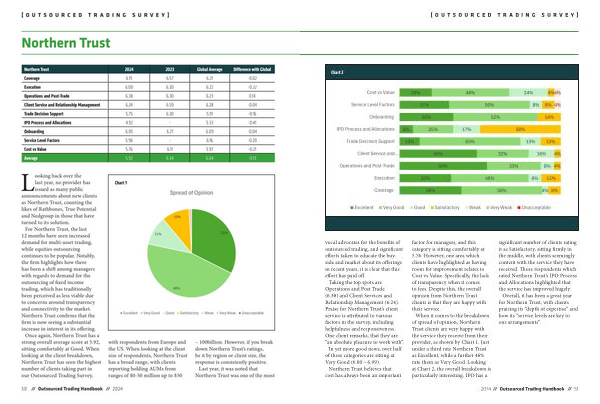 vocal advocates for the benefits of outsourced trading , and significant efforts taken to educate the buyside and market about its offerings in recent years , it is clear that this effort has paid off . Taking the top spots are Operations and Post Trade ( 6.38 ) and Client Services and Relationship Management ( 6.24 ). Praise for Northern Trust ’ s client service is attributed to various factors in the survey , including helpfulness and responsiveness . One client remarks , that they are “ an absolute pleasure to work with ”. In yet more good news , over half of these categories are sitting at Very Good ( 6.00 – 6.99 ). Northern Trust believes that cost has always been an important factor for managers , and this category is sitting comfortably at 5.76 . However , one area which clients have highlighted as having room for improvement relates to Cost vs Value . Specifically , the lack of transparency when it comes to fees . Despite this , the overall opinion from Northern Trust clients is that they are happy with their service . When it comes to the breakdown of spread of opinion , Northern Trust clients are very happy with the service they receive from their provider , as shown by Chart 1 . Just under a third rate Northern Trust as Excellent , while a further 46 % rate them as Very Good . Looking at Chart 2 , the overall breakdown is particularly interesting . IPO has a significant number of clients rating it as Satisfactory , sitting firmly in the middle , with clients seemingly content with the service they have received . Those respondents which rated Northern Trust ’ s IPO Process and Allocations highlighted that the service has improved hugely . Overall , it has been a great year for Northern Trust , with clients praising its “ depth of expertise ” and how its “ service levels are key to our arrangements ”.