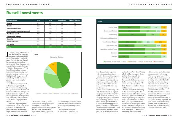 Post-Trade take the top spots , with both categories sitting at 6.33 . It will come as little surprise , given these scores , that there is a lot of praise from respondents , in particular with regards to how responsive Russell Investments is and how helpful the firm is at resolving issues . What is also worth noting is that only the Trade Decision Support category is not rated as Very Good ( 5.63 ). However , even then , this category is firmly in the top half of the Good rating . When it comes to the overall spread of opinion , it is an overwhelmingly positive picture - as Chart 1 demonstrates . The majority of respondents – over three quarters – rated the service provided by Russell Investments as Excellent or Very Good . Taking a look at Chart 2 , we get a clearer picture of the respondents ’ attitudes towards Russell Investments . Onboarding has the highest volume of clients rating it as Excellent , closely followed by both Operations and Post-Trade and Execution . What is particularly interesting is that while Coverage has the lowest number of Excellent ratings , there are a significant number of clients highlighting the category as Very Good . Multiple clients have been quick to pile on the praise , specifically on how easy the firm is to work with , their transparency , the excellence of their service , and their coverage of FX transactions and ability to simplify things .