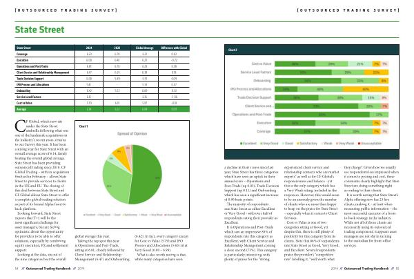 CF Global , which now sits under the State Street umbrella following what was one of the landmark acquisitions in the industry ' s recent years , returns to our Survey this year . It has been a strong year for State Street with an overall average score of 6.14 , firmly beating the overall global average . State Street has been providing outsourced trading since 2010 . CF Global Trading – with its acquisition finalised in February – allows State Street to provide services to clients in the UK and EU . The closing of this deal between State Street and CF Global allows State Street to offer a complete global trading solution as part of its formal Alpha front-to back platform . Looking forward , State Street expects that T + 1 will be the most significant challenge for asset managers , but are feeling optimistic about the opportunity for providers to be able to offer solutions , especially by combining equity execution , FX and settlement support . Looking at the data , six out of the nine categories beat the overall