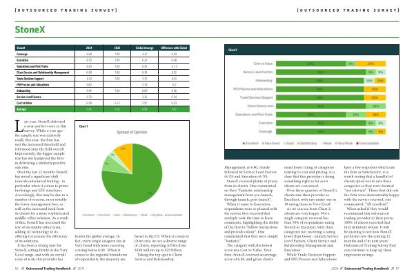 Last year , StoneX delivered a near-perfect score in this survey . While a year ago the sample size was relatively small , this year , the firm has met the increased threshold and still stood atop the field overall . Impressively , the bigger sample size has not hampered the firm in delivering a similarly positive outcome . Over the last 12 months StoneX has noted a significant shift towards outsourced trading - in particular when it comes to prime brokerage and ETF structures . Accordingly , this may be due to a number of reasons , most notably the lower management fees , as well as the increased need from its clients for a more sophisticated middle-office solution . As a result of this , StoneX has increased the size of its middle-office team , adding AI technology to its offering to increase the efficiency of its solutions . It has been a strong year for StoneX , sitting firmly in the Very Good range , and with an overall score of 6.46 , this provider has