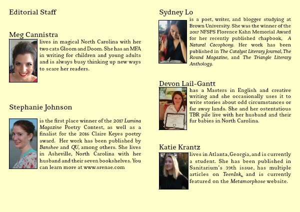 is the first place winner of the 2017 Lumina Magazine Poetry Contest, as well as a finalist for the 2016 Claire Keyes poetry award. Her work has been published by Banshee and QU, among others. She lives in Asheville, North Carolina with her husband and their seven bookshelves. You can learn more at www.srenae.com