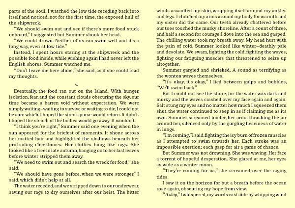 But I could not see the shore, for the water was dark and murky and the waves crashed over my face again and again. Salt stung my eyes and no matter how much I squeezed them shut, the water continued to seep in as if claiming me as its own. Summer screamed louder, her arms thrashing the air around her, silenced only by the gurgling heaviness of water in lungs.