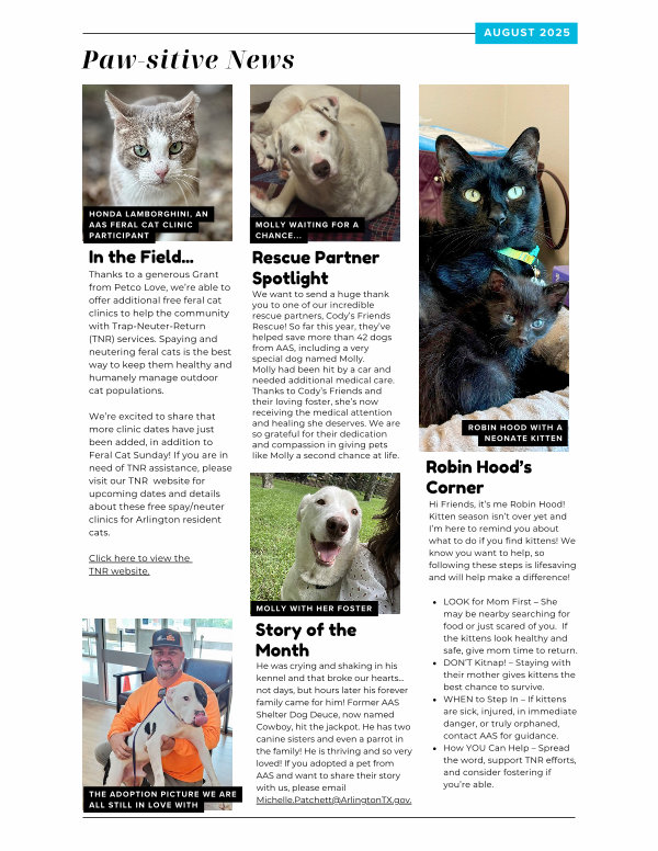 We’ re excited to share that more clinic dates have just been added, in addition to Feral Cat Sunday! If you are in need of TNR assistance, please visit our TNR website for upcoming dates and details about these free spay / neuter clinics for Arlington resident cats.