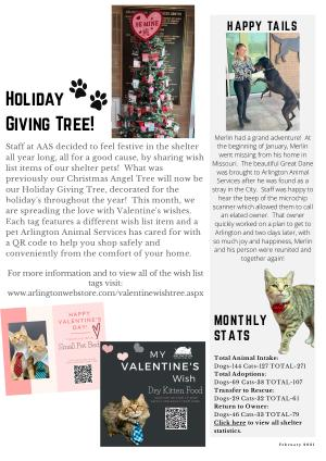 Staff at AAS decided to feel festive in the shelter all year long , all for a good cause , by sharing wish list items of our shelter pets ! What was previously our Christmas Angel Tree will now be our Holiday Giving Tree , decorated for the holiday ' s throughout the year ! This month , we are spreading the love with Valentine ' s wishes . Each tag features a different wish list item and a pet Arlington Animal Services has cared for with a QR code to help you shop safely and conveniently from the comfort of your home .